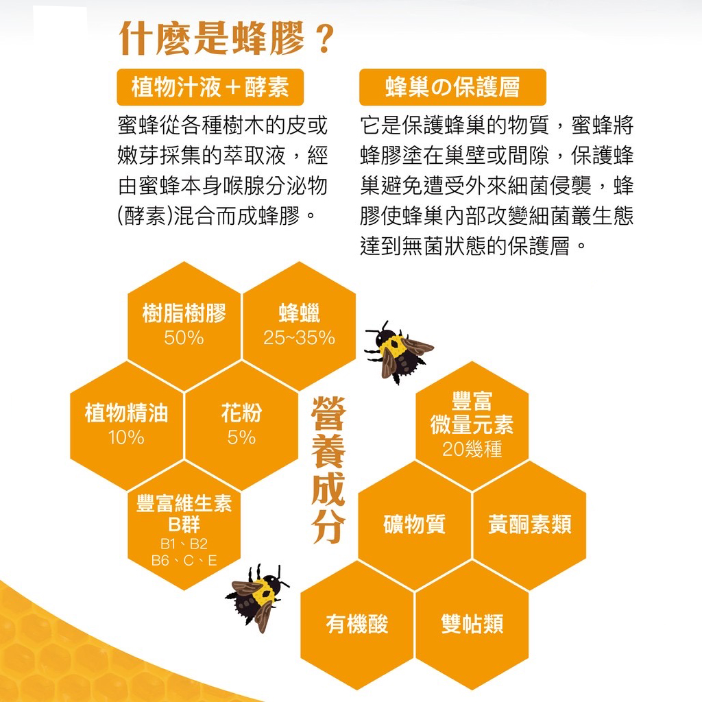 【蜂膠介紹】 蜂膠(propolis)和蜂蜜及蜂王乳 都是蜜蜂製造的天然物質。 它最初被發現於蜂巢的入口處,因而得名。 換言之,它是保護蜂巢的物質, 蜜蜂從各種樹木的皮或嫩芽採集的萃取液 由蜜蜂本身喉腺分泌物(酵素) 混合而成蜂膠, 並在產卵前塗在巢壁或間隙, 保護蜂巢內部,使得蜂巢內部, 即蜜蜂將採集到的樹脂物質與其唾液混合後, 會產生一種黑褐色像柏油一般的膠狀物質, 確保蜂房內能使居住環境成無菌狀態, 這膠狀物質就稱為蜂膠。